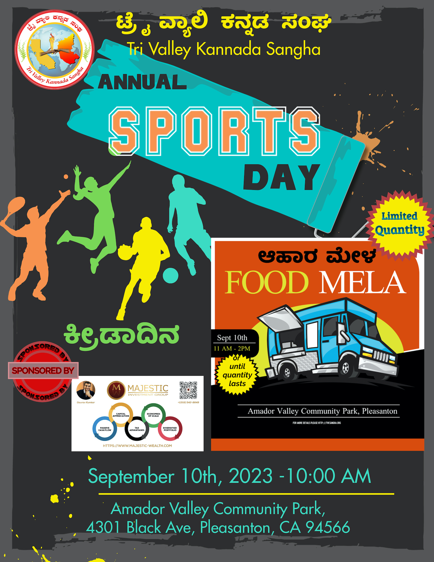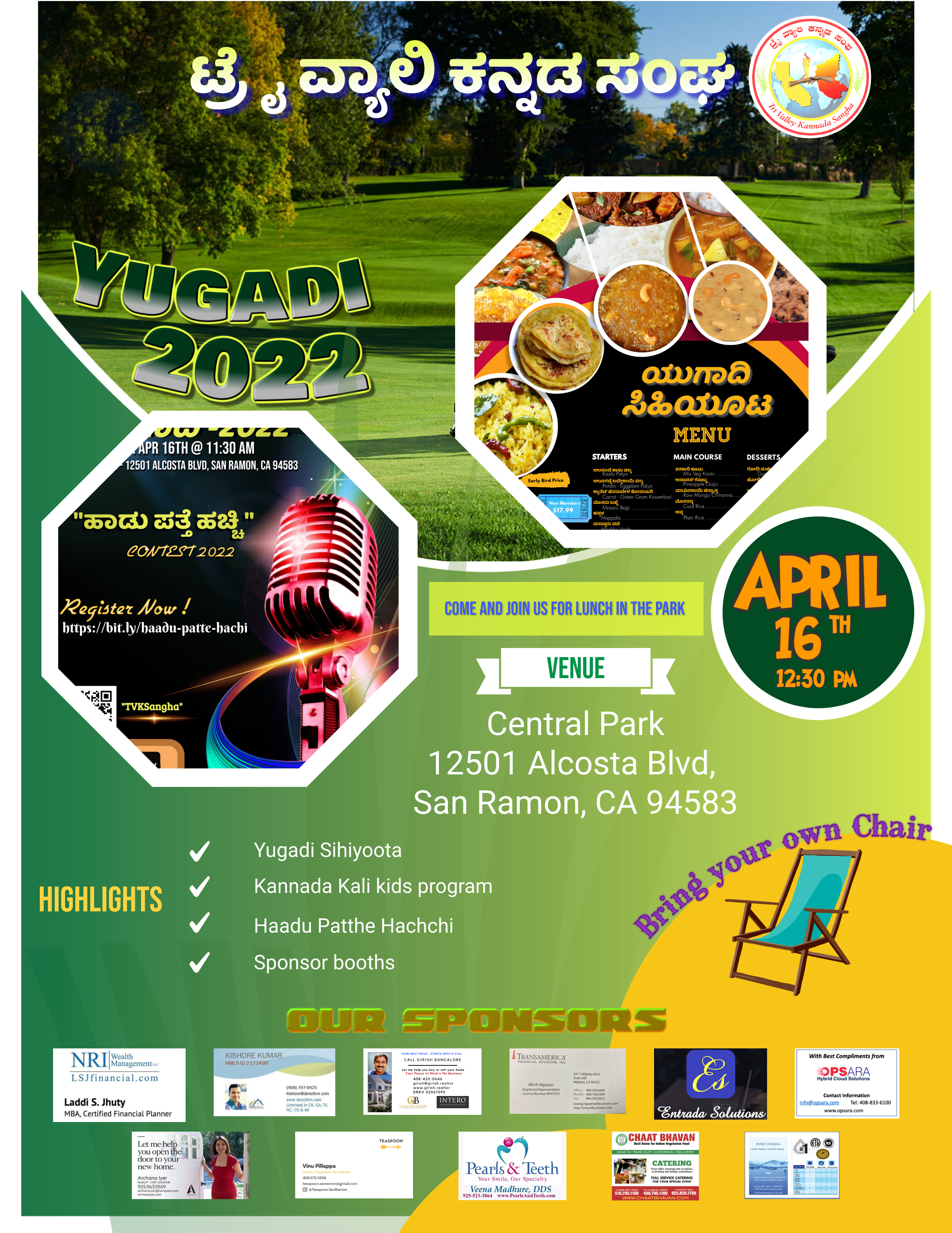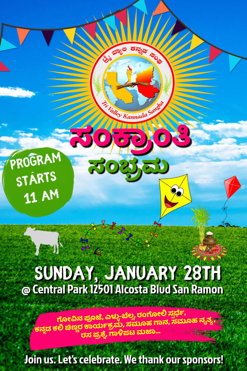 We’re celebrating Sankranti on January 28, 2024 at Central Park in San Ramon from 11 am to 1 pm. At this event, we will have a bunch of entertainment programs, kite-flying, rangoli competition, ellu-bella distribution, and so on.