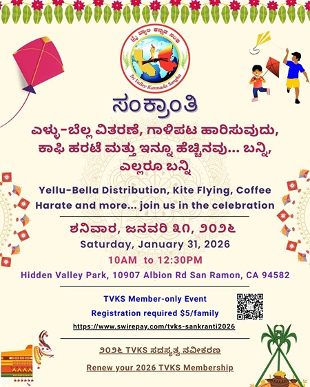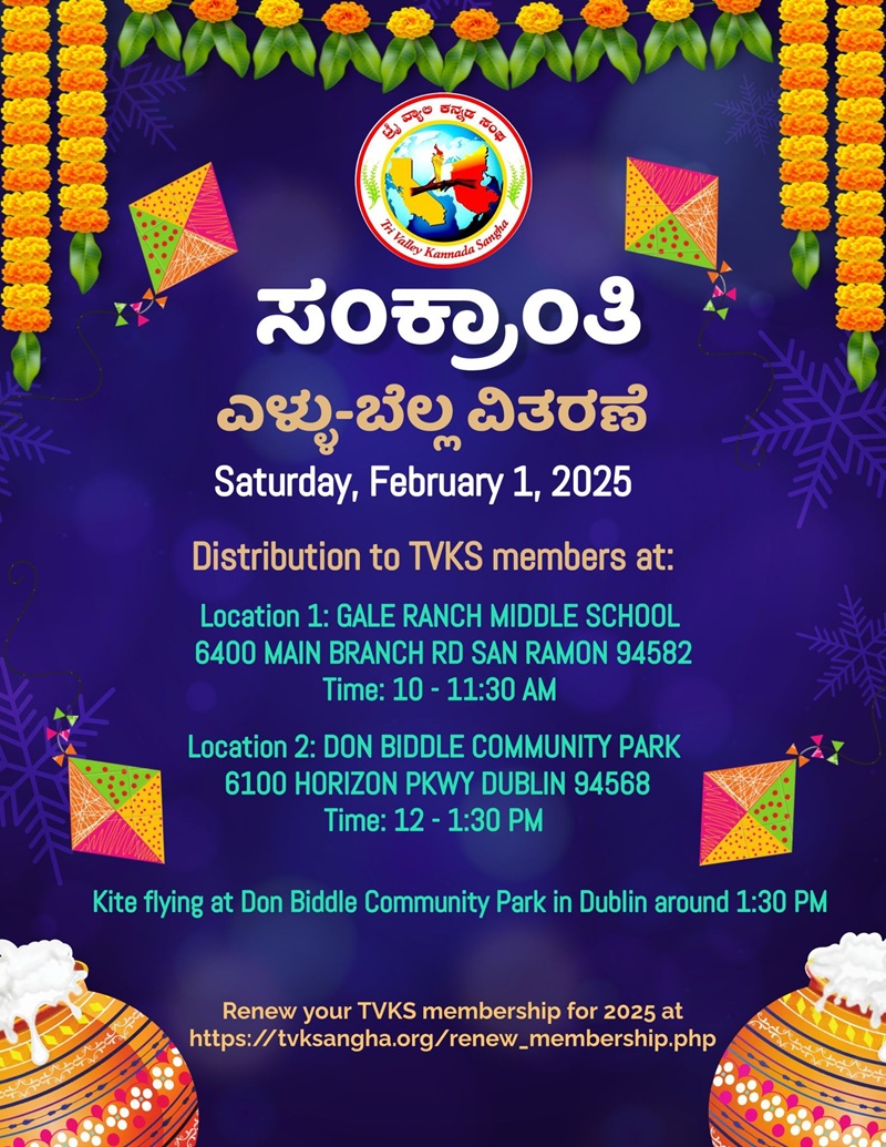 Tri Valley Kannada Sangha (TVKS) is celebrating Sankranti, the harvest festival, on Saturday, February 1, 2025. This event is for TVKS members only.